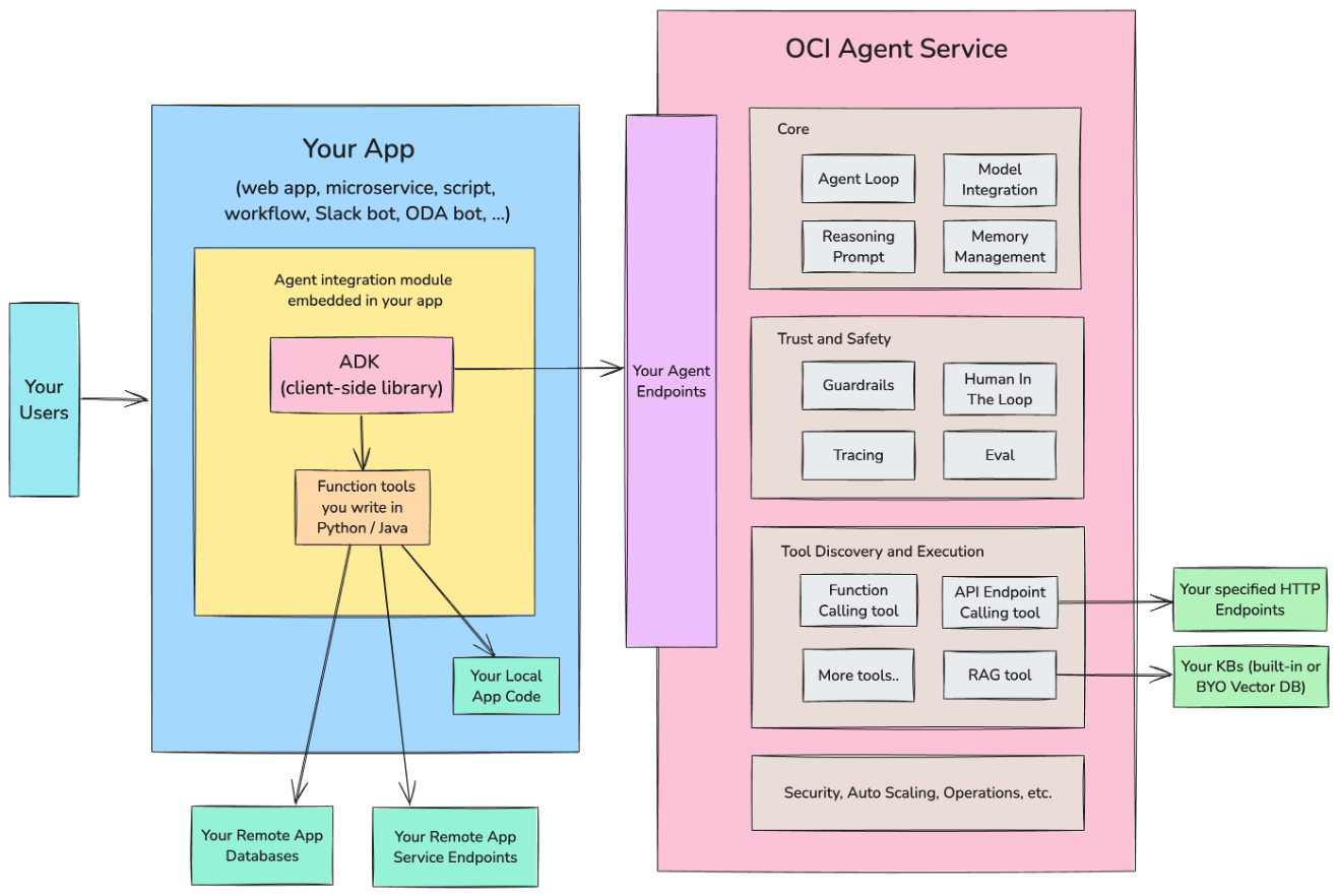ADK requires an agent endpoint to function much like a client-side agent framework needs an LLM endpoint. Think of the agent endpoint as an enhanced LLM endpoint, offering advanced agentic features such as optimized reasoning prompts and server-side tools from OCI. ADK doesn't support direct connections to raw LLM endpoints.