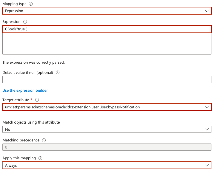 バイパス通知フラグは、OCIでユーザー・アカウントを作成または更新した後に電子メール通知を送信するかどうかを制御します。アカウントが作成されたことをユーザーに通知しない場合は、バイパス通知フラグをtrueに設定します。